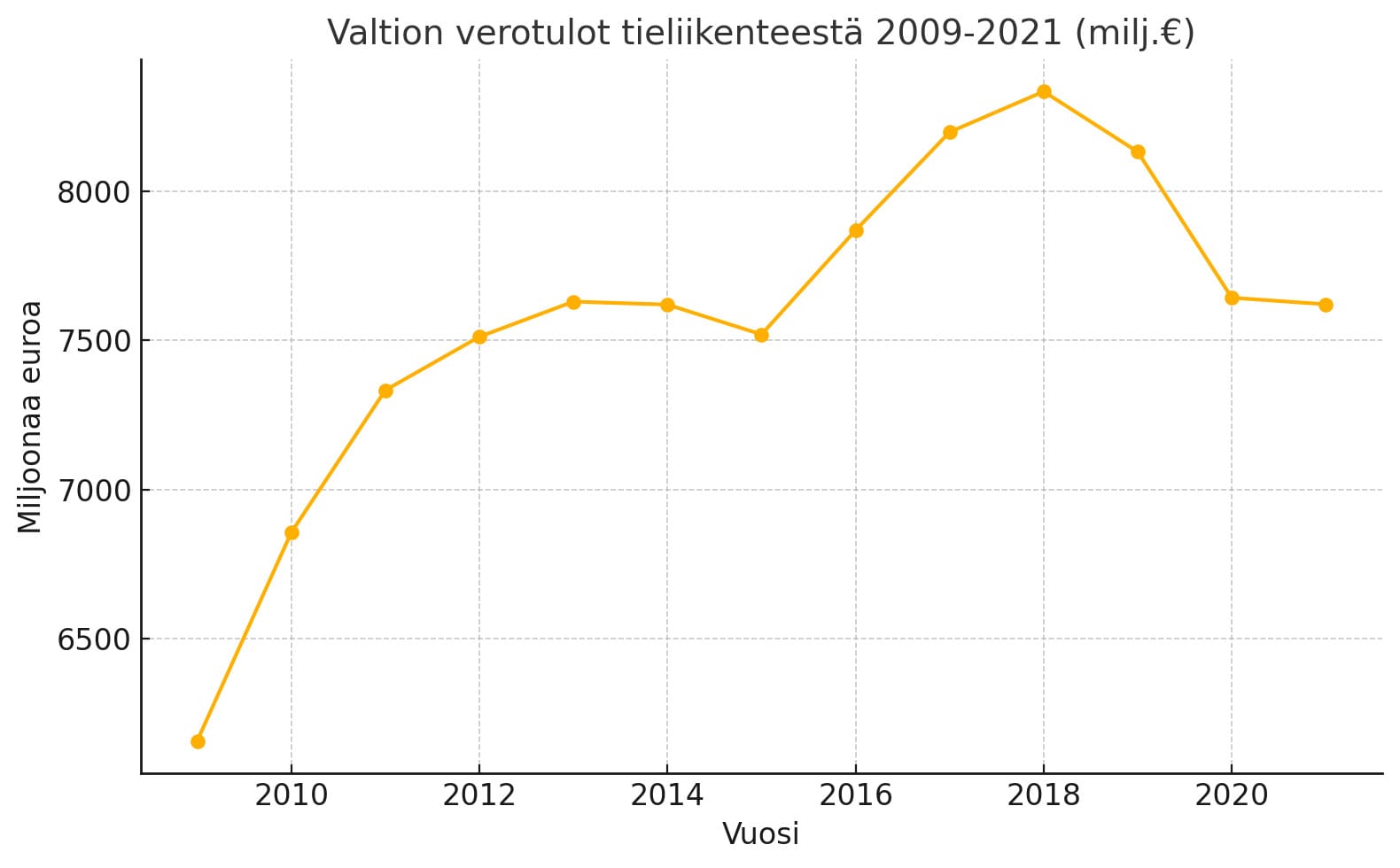 Kuten yllä olevasta kuvaajasta nähdään, 2010-luvun lopulla autoilun verotuotot saavuttivat ennätyksiä. Vuonna 2018 tieliikenteestä kertyi valtiolle noin 8,3 miljardin euron tulot. Tämän jälkeen sähköautojen yleistyminen, polttoaineiden kulutuksen hienoinen lasku ja veroperusteiden muutokset ovat hieman vähentäneet tuottoja: vuonna 2021 kokonaissumma oli noin 7,6 mrd €. Silti autoilijat rahoittavat yhä huomattavan siivun julkista taloutta. Autoiluun kohdistuvien erillisverojen osuus Suomen kokonaisverokertymästä on viime vuosina ollut noin 3–5 %. Huippuvuosina se lähenteli 5 %, kun taas 2020-luvulla osuus on laskenut alle 4 %:iin verotuloista. Suhteessa bruttokansantuotteeseen tieliikenteen erillisverot tuottavat noin 1,5–2 % BKT:stä, mikä osoittaa autoilun olevan edelleen yksi valtion merkittävistä tulonlähteistä.