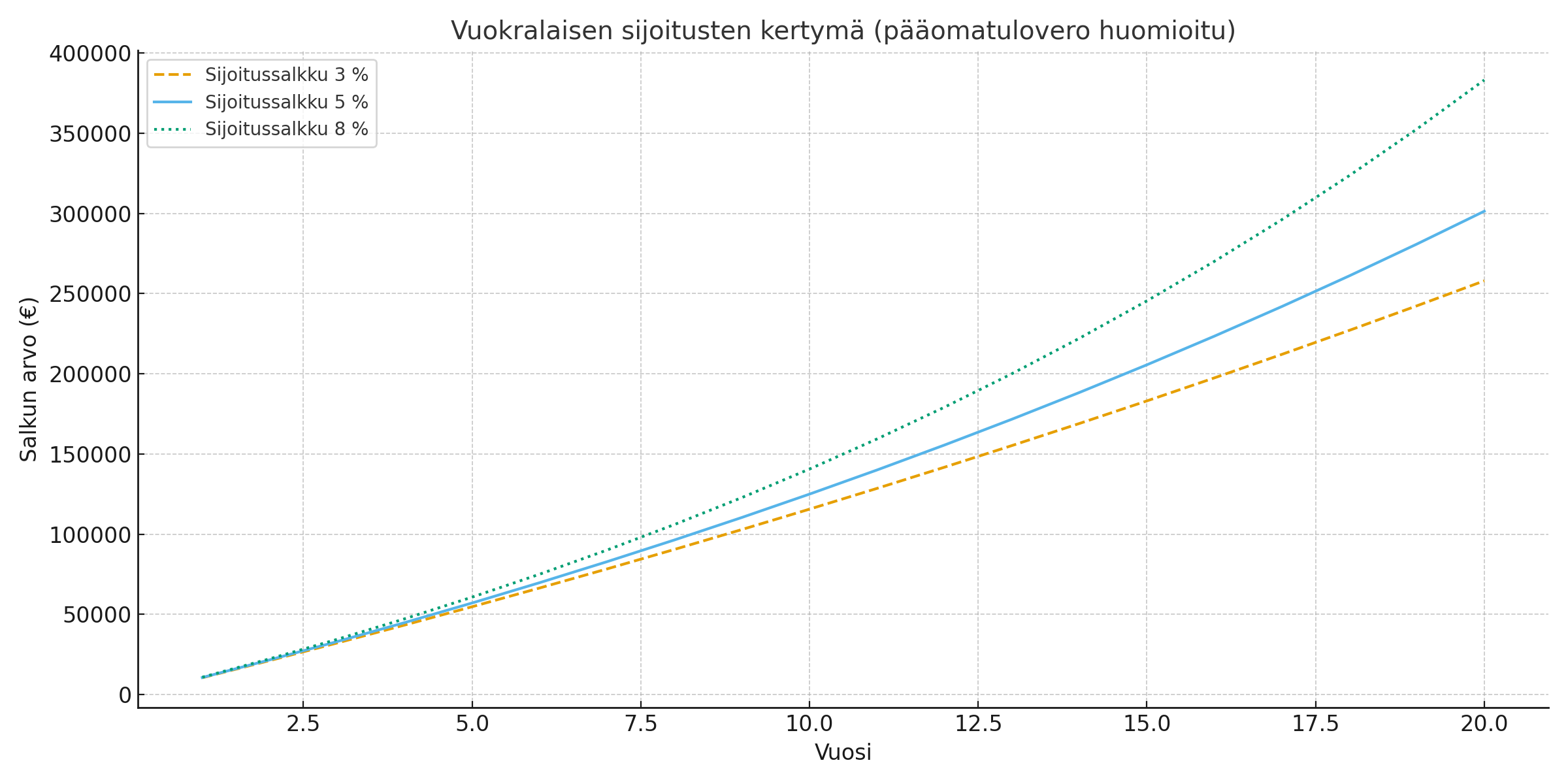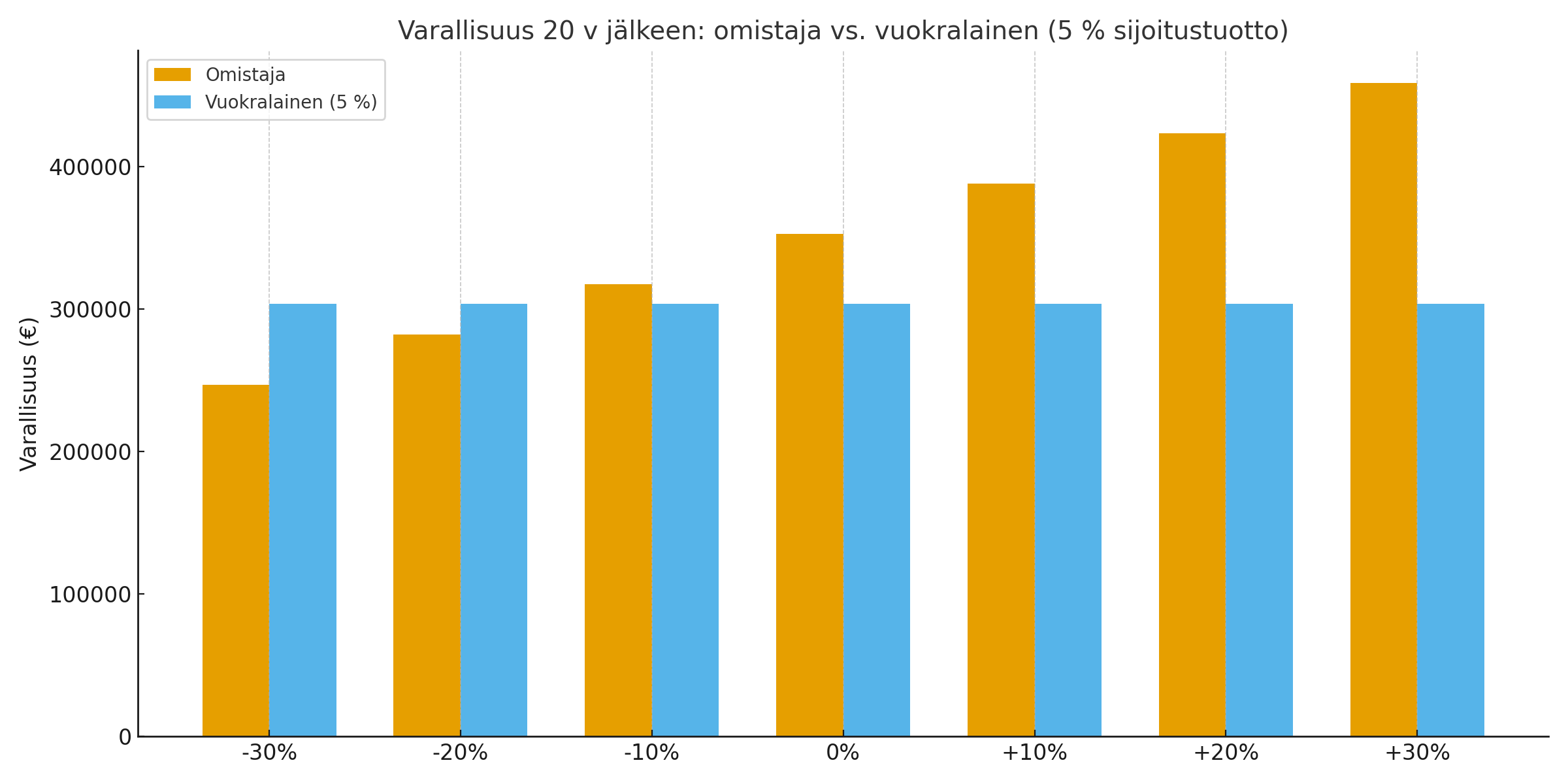 - Sijoittaminen ratkaisee: jos vuokralainen sijoittaa säästönsä ≥ 5 % tuotolla, hän ohittaa omistajan varallisuudessa jo pienellä hinnanlaskulla.