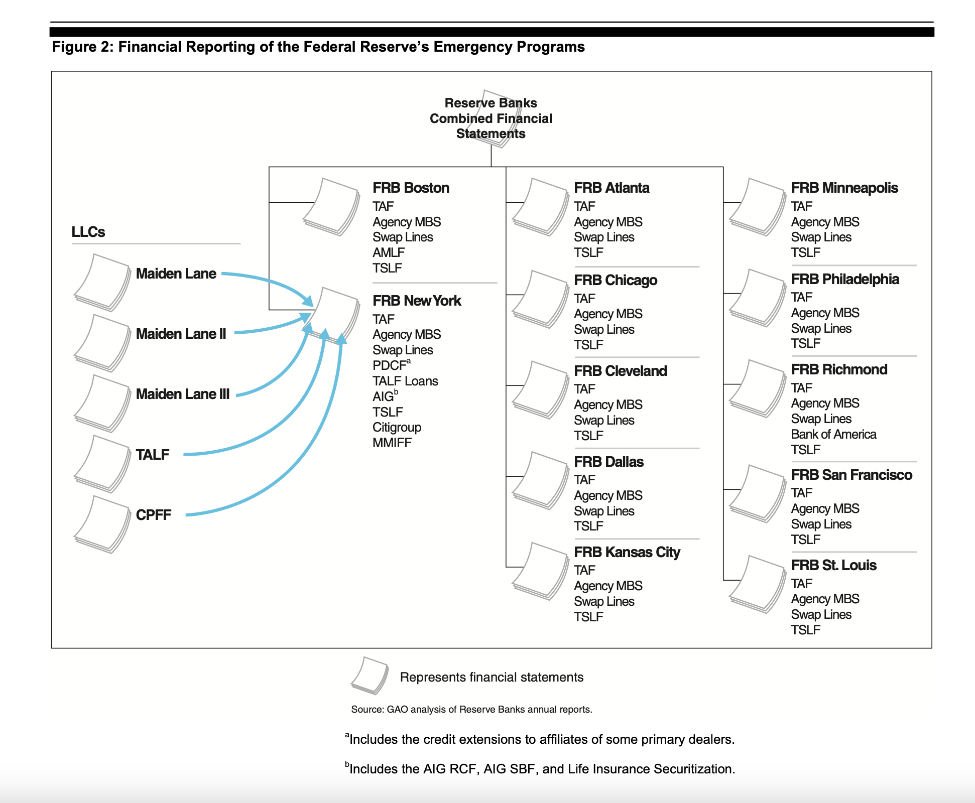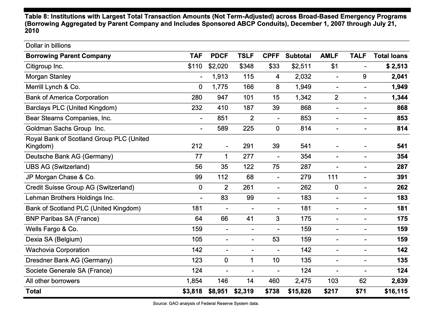 Vaikuttaa siltä, että suurin osa näistä lainatoimista hoidettiin New Yorkin keskuspankissa ja suurin osa uudistuvista lainoista myönnettiin New Yorkin keskuspankin jäsenpankeille. GAO:n tarkastuksen mukaan näyttää siltä, että 40 prosenttia uusiutuvien lainojen kokonaismäärästä, joka oli 16,1 biljoonaa dollaria, meni vain kolmelle newyorkilaiselle pankille: Citigroup, joka sai 2,513 biljoonaa dollaria, Morgan Stanley, joka sai 2,041 biljoonaa dollaria, ja Merrill Lynch, joka sai 1,949 biljoonaa dollaria. (Ks. alla oleva tiivistelmän omainen galleria GAO:n raportista.) On syytä huomata, että Merrill Lynch on nykyään osa Bank of America -yhtiötä, joka on Richmondin keskuspankin osakkeenomistaja.
