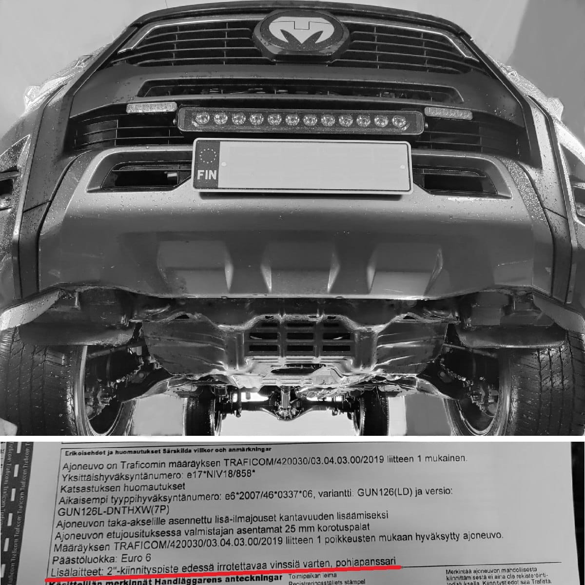 E) N2 yksittäishyväksynnät ilman takaosan alleajosuojaa. Pelkän muovipuskurin tai ohuen peltilevyn hyväksyntä takaosan alleajosuojaksi E-säännön vastaisesti. Myös tämä ongelma on ollut pari vuotta Traficomin tiedossa, mutta siihen ei ole puututtu.