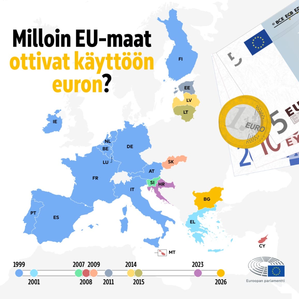 Euro otettiin käyttöön kirjanpitovaluuttana 1999 ja käteisvaluuttana 2002. Suomen markka poistui käytöstä.