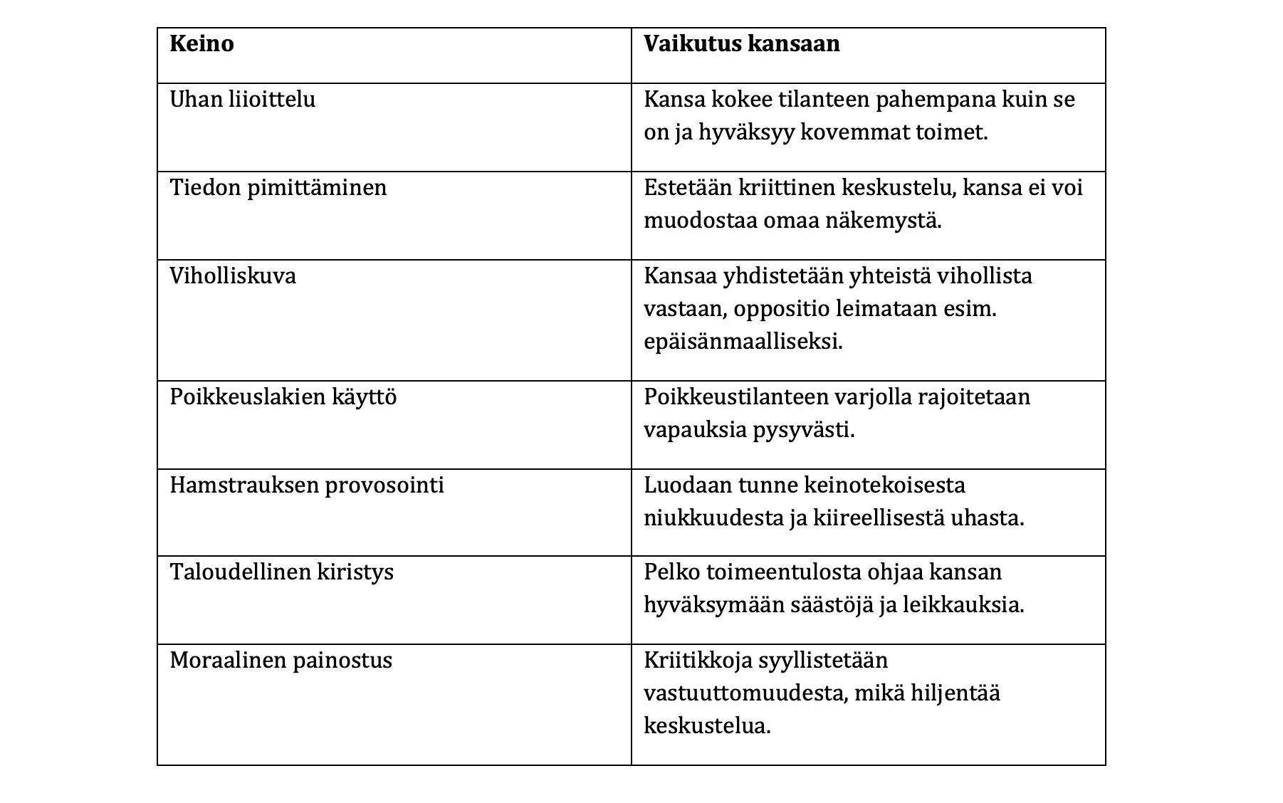 Pelko on ollut kaikkina ihmiskunnan aikoina vallankäytön ytimessä. Se vaikuttaa ihmisen syvimpään vaistoon: selviytymisen tarpeeseen. Vallanpitäjät ovat toistuvasti hyödyntäneet pelkoa saadakseen kansat hyväksymään rajoituksia, poikkeuslakeja ja kurinalaisuutta. Tämä artikkeli käy otsikoiden tasolla läpi historiallisia ja suomalaisia esimerkkejä aina antiikista 2020-luvulle.