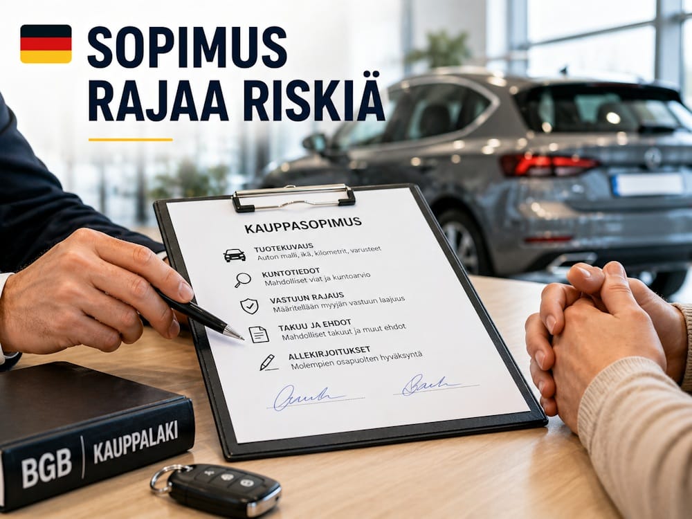 Samalla saksalaisessa autokaupassa korostuu tarkka sopiminen ja auton kunnon yksityiskohtainen kuvaaminen. Auto ei ole geneerinen tuote, vaan yksilö, jonka ominaisuudet määritellään tarkasti.