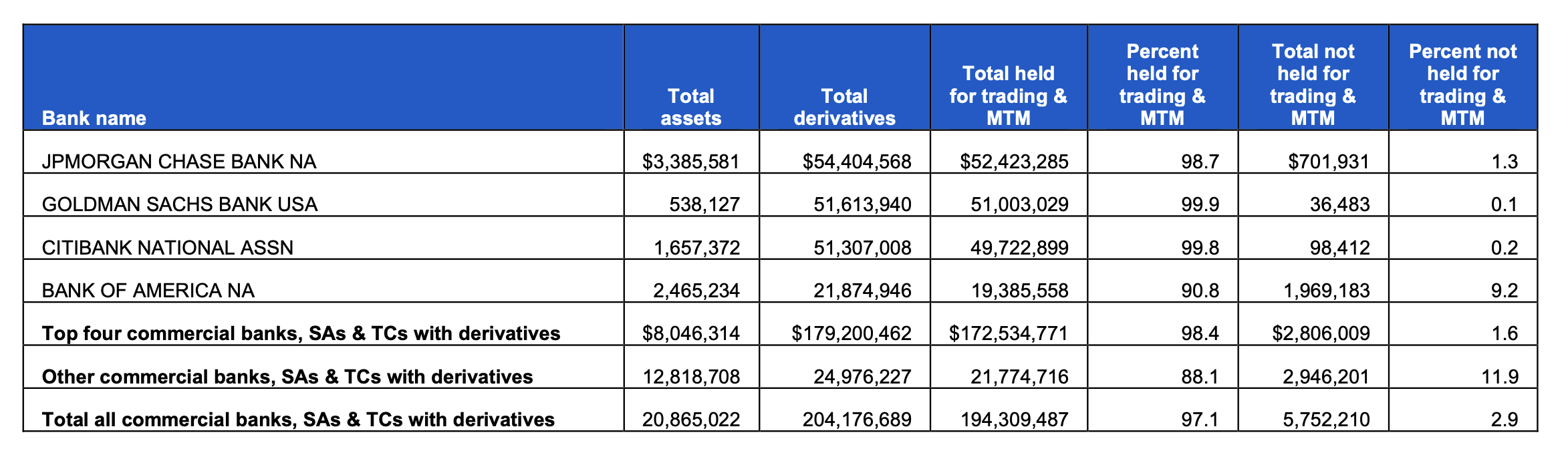 Kuten alla olevasta kaaviosta käy ilmi, 31. joulukuuta 2023 Goldman Sachs Bank USA:lla, JPMorgan Chase Bank N.A:lla, Citigroupin Citibankilla ja Bank of Americalla oli yhdessä hallussaan yhteensä 168,26 biljoonan Yhdysvaltain dollarin arvosta johdannaisia, mikä vastaa 88 prosenttia kaikkien liittovaltion vakuutuksen piiriin kuuluvien yhdysvaltalaisten pankkien, säästöyhdistysten ja rahastoyhtiöiden hallussaan pitämistä johdannaisista, joiden arvo on 192,46 biljoonaa dollaria. Tämä tarkoittaa, että neljällä pankilla on hallussaan 87 prosenttia kaikista johdannaisista kaikissa 4587 liittovaltion vakuuttamassa rahoituslaitoksessa Yhdysvalloissa 31. joulukuuta 2023.