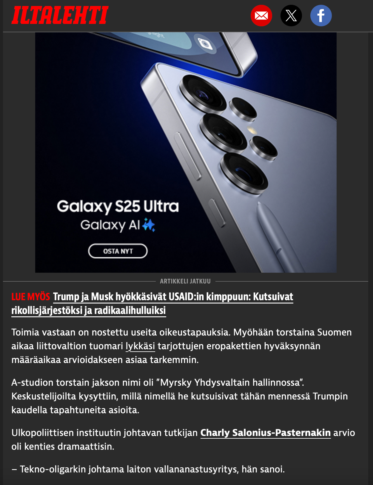 Kuvakaappaukset Iltalehden julkaisusta 7.2.2025, linkki jutun lopussa
