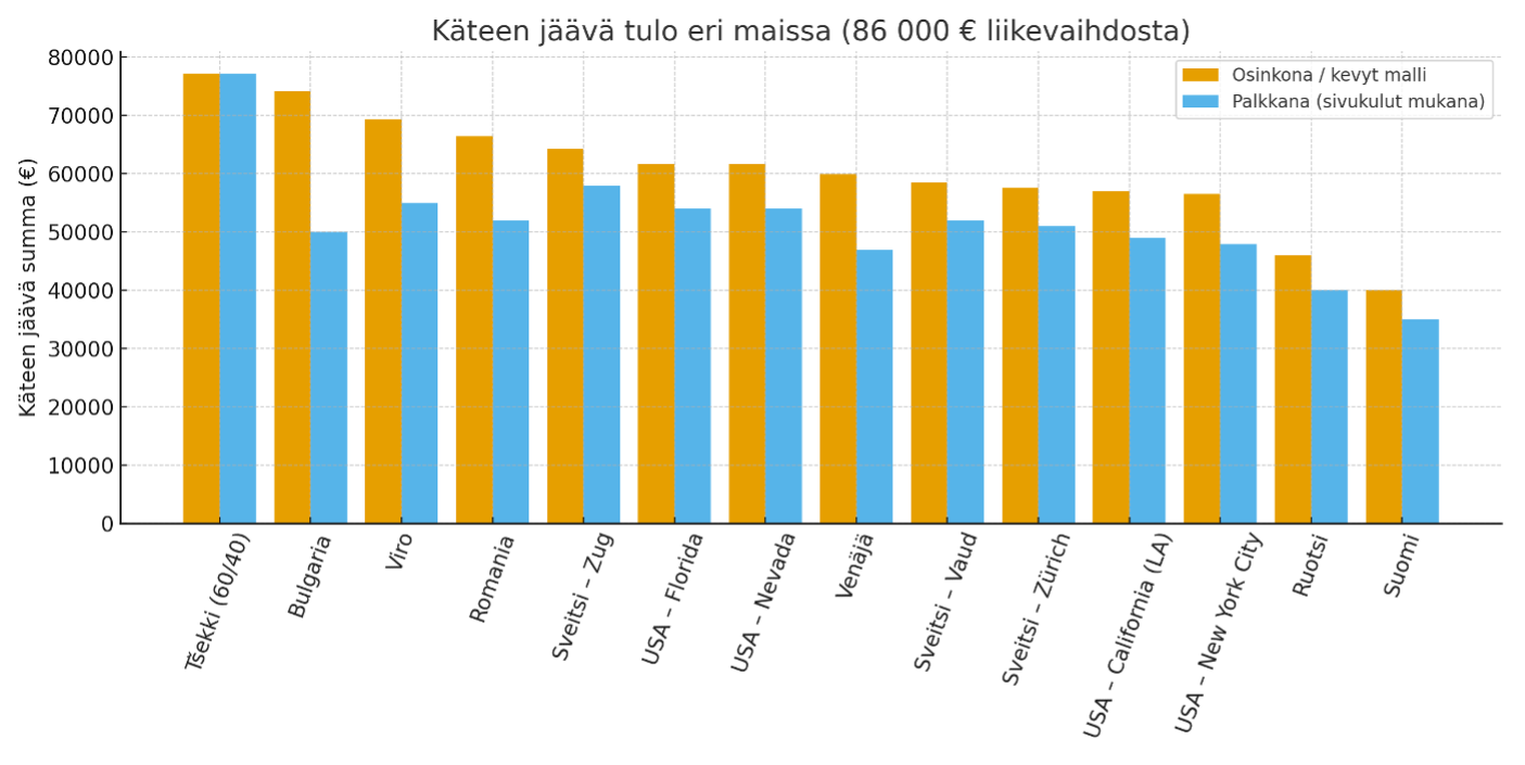 Monissa maissa 86000€ raha laskutettuna yritykseen riittää normaaliin elämiseen tai ainakin näin voisi kuvitella. Yhtiöverotus, palkkaverotus ja täysin pakolliset sivukulut vievät siitä hyvin erilaisen osan eri maissa jo ennen kuin sinulla on mitään käytettävissä. Lisäksi muut kulut kuten arvonlisäveron kulu, viranomaismaksut ja yleinen hintataso tulee huomioida.