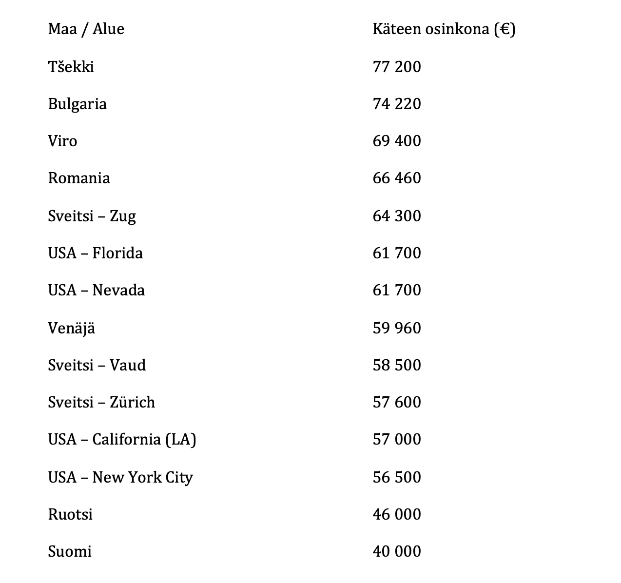 Vertailimme useita maita, sekä Sveitsissä ja USA:ssa otimme huomioon eri osavaltiot. Verotus on hyvin henkilökohtaista ja pienet vähennykset muuttavat summaa jonkin verran. Huomioimme vähennykset niin, että sinulla on kolme alaikäistä lasta. Tämän vaikutus nettotuloon on kuitenkin vain noin 1-2%. Valitsimme laskutussumman 90000e sen perusteella, että esimerkiksi tietotyöläinen pystyy tämän summan laskuttamaan työstään vuodessa. Lisäksi huomioimme, että esimerkiksi tietoliikenne- ja muita kuluja olisi noin 4000€ vuodessa. Toki on melko yhdentekevää mitä työtä teet, verotus on sama jos vaan tulos on vertailun mukainen.