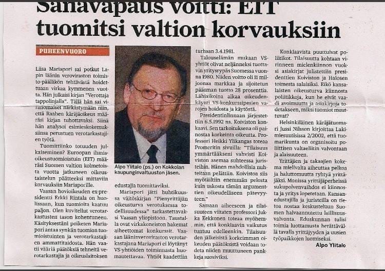 Tätä taustaa vasten myös Liisa Mariaporin tapaus saa erityistä merkitystä. Alpo Ylitalo kirjoitti aikanaan otsikolla Sananvapaus voitti: EIT tuomitsi valtion korvauksiin, ja liitti Mariaporin tapauksen laajempaan verottajan vallankäytön arvosteluun.